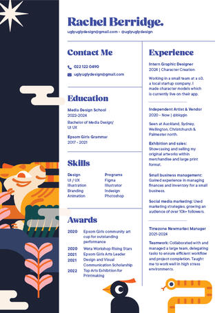 Kia ora!I’m Rachel, a UI UX student who truly lives and breathes design. It’s not just my work, it’s my passion—I revolve my life and hobbies around it, which is why I put my all into everything I do. Alongside my studies, I’m a freelance illustrator and designer.I adore games and they're often what you'll catch me playing in my free time - I often adore playing indie games or Nintendo games, mainly just any brimming with personality! - My favourites are bloons TD6 & Splatoon.In my free time, you can usually catch me drawing or learning something new, I am constantly pushing myself to improve my skills. This drive has given me extensive knowledge in Illustrator and other design programs. I also love to push creative boundaries and make bold, expressive design choices that stand out—something you don’t often find elsewhere.